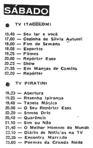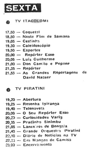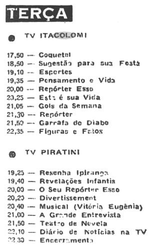 Numa edição de 1960 a “Revista do Rádio” divulgava a programação das duas capitais. Nesse ano ainda só havia uma tv em cada cidade, as pioneiras Itacolomi e Piratini.
