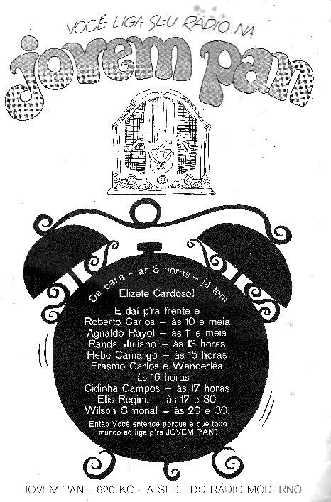 Era 1965, a Record liderava a audiência da tv com seus musicais. Tuta conversou com quase todos os cartazes da emissora e os convenceu a ocupar faixas da programação para conversar com seus fãs. O que hoje as celebridades fazem nas redes sociais, naquele momento Tuta abria espaço para que isso acontecesse no rádio. E a força transformadora da Jovem Guarda alavancou a nova rádio Jovem Pan. Não havia nada parecido. A rádio fugia de todos os formatos praticados mundo afora. Foi uma absoluta novidade. Vejam no anúncio a lista de astros e estrelas que ocupavam o microfone da emissora.